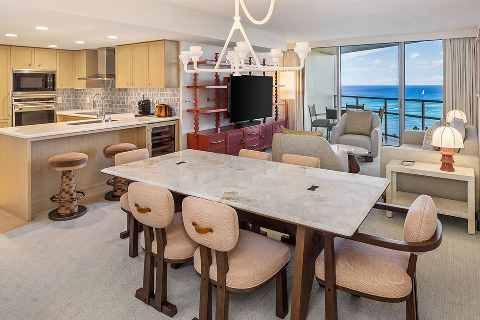 全231室のゲストルーム-ラナイ付き(一部を除く)では、床から天井まで広がる大きな窓から開放感あふれる眺望をお楽しみいただけます。ゆったりとした深いバスタブで旅の疲れを癒してください。スタジオは簡易キッチン付き。スイートはフルキッチン、洗濯機・乾燥機を完備しています。新たな装いのレジデンシャルスタイルで洗練された快適さをご堪能ください。